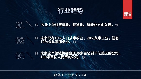 农业是我们国家最古老、最基础的行业。然而,无论是农业的生产效率,还是农民收入,都还有很大的提升空间。农业领域,也没有出现有竞争力的农产品品牌和互联网创业公司。但是随着社会的发展,土地、技术、市场等要素都在发生变化,我们相信,未来中国的农业将大有可为。